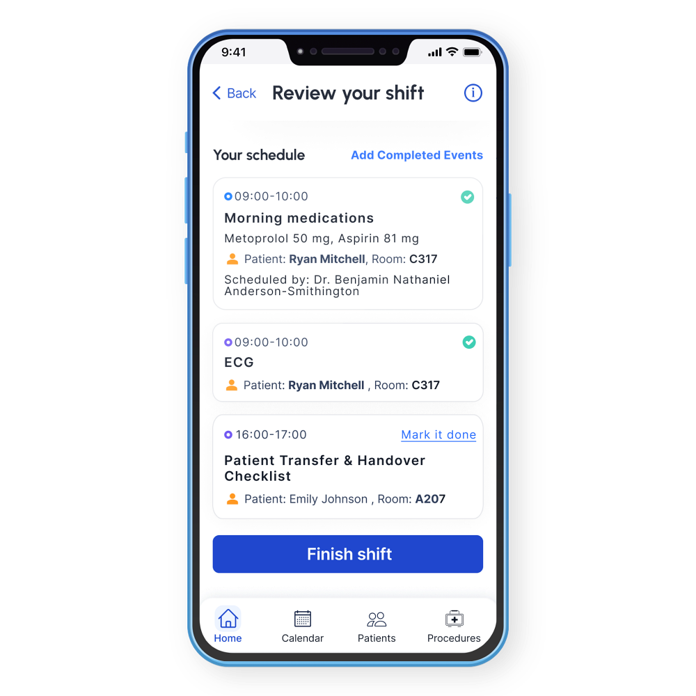 Smart shift and task management — schedule medications, procedures, and patient care with reminders and adaptable shift planning